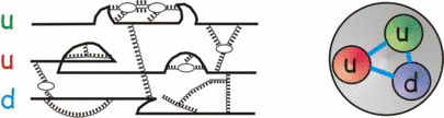 Over the years, theoreticians have developed models of the nucleon. One rather promising ansatz is the description of baryons as systems of so-called constituent quarks. In this picture the nucleon is described by three constituent quarks moving in a confined potential and being subject to a residual interaction. These constituent quarks consist of the bare quarks that are responsible for the properties of the constituent quarks and of the effects these bare quarks have on the surrounding QCD vacuum. Due to the self interaction of gluons and the anti-screening of the color charge one obtains an object composed of a bare quark inside a cloud of gluons and additional quark-anti-quark pairs generated from the vacuum (sea quarks). The mass of the baryon is made up of the interaction mainly. The constituent quark is in a way a container for a QCD quark as shown below: The bare quark lines are girdled by emissions of gluons and generations of quark-anti-quark pairs. The residual interaction takes place between two quark lines.